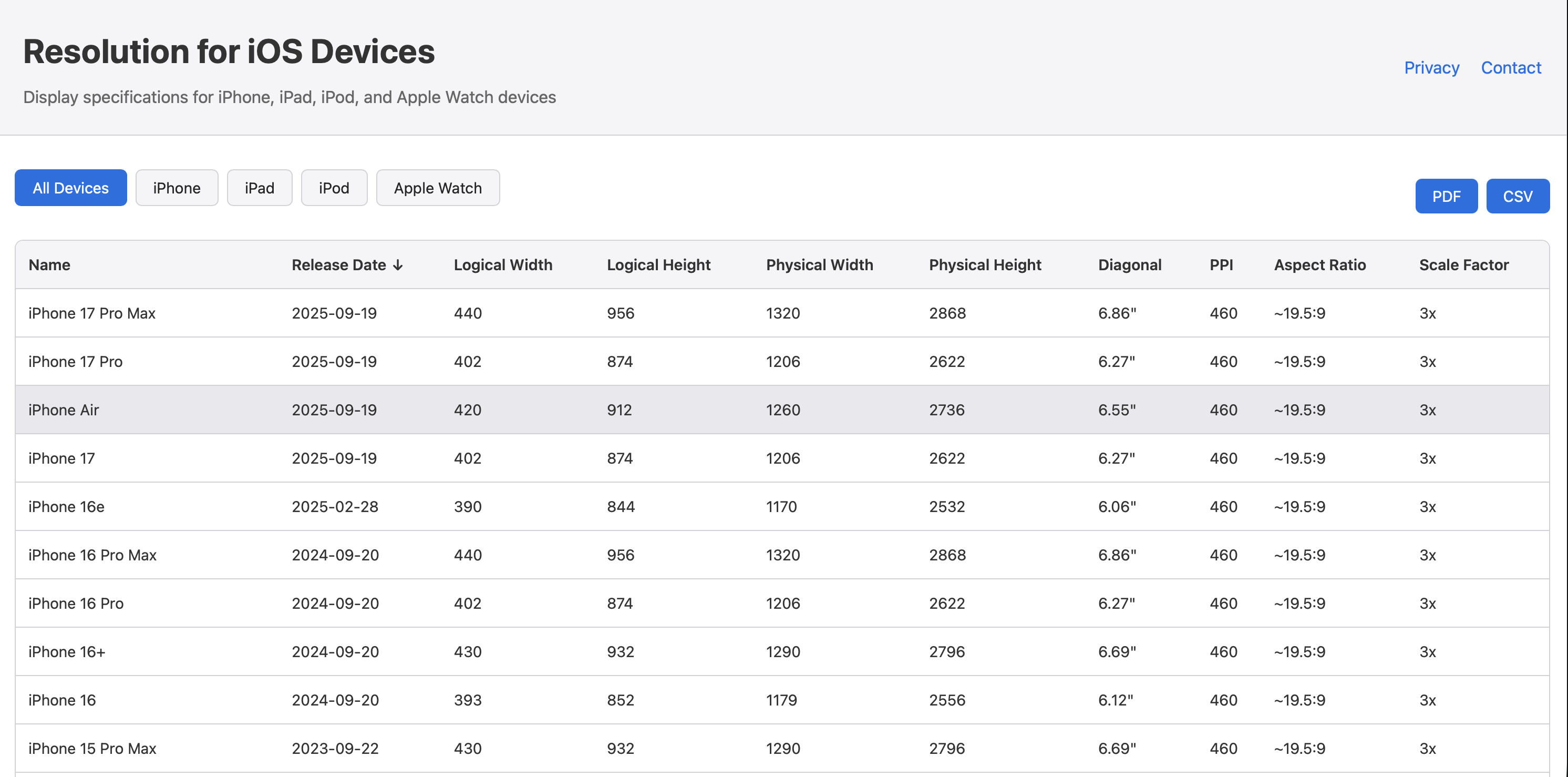 A reference site listing all iPhone, iPad, iPod, and Apple Watch display specifications. Built for developers and designers looking for quick access to device data.